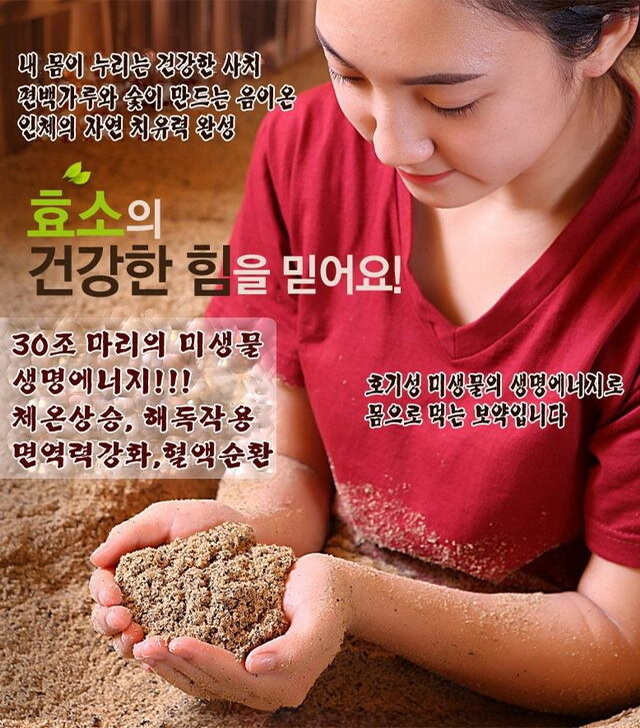 사우나와 암반욕에는 없는 효소찜질 특유의 온열체험, 자연 발열하는 효소열에 어깨에서 발 끝까지 미생물의 자연열이 전달되어 체온을 올리며, 혈액순환을 촉 진하고 신진대사를 활발하게 하는 발한작용은 마라톤 15km, 에어로빅 2시간 운 동을 하는 것과 같은 효과가 있어 인간이 본래 가지고있는 자연 치유력을 높이는 효과도 가지고 있습니다.