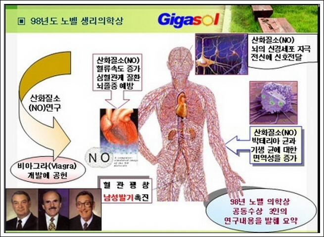 혈관 내벽에 혈관을 보호하기 위해 생성되는 물질을 "산화질소"라고 합니다. 혈관을 확장시켜주고 유연하게하며 탄력있게 유지시키는 중요한 역활을 하는게"산화질소"이며 "산화질소"는 순환계에선 혈전의 생성을 억제시키며, 면역계에선 감염성 세균이나 바이러스도 퇴치해주고 신경계에선 뇌의 장기 기억능력을 향상시키는 역활도합니다.